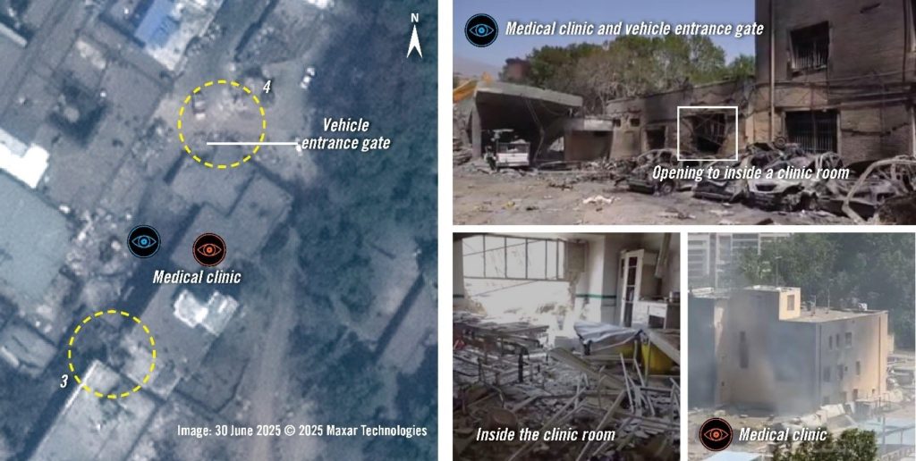 Las imágenes de satélite muestran daños importantes en las estructuras adyacentes a la clínica, mientras que los vídeos verificados revelan los daños causados a la clínica por la explosión y los coches en llamas.